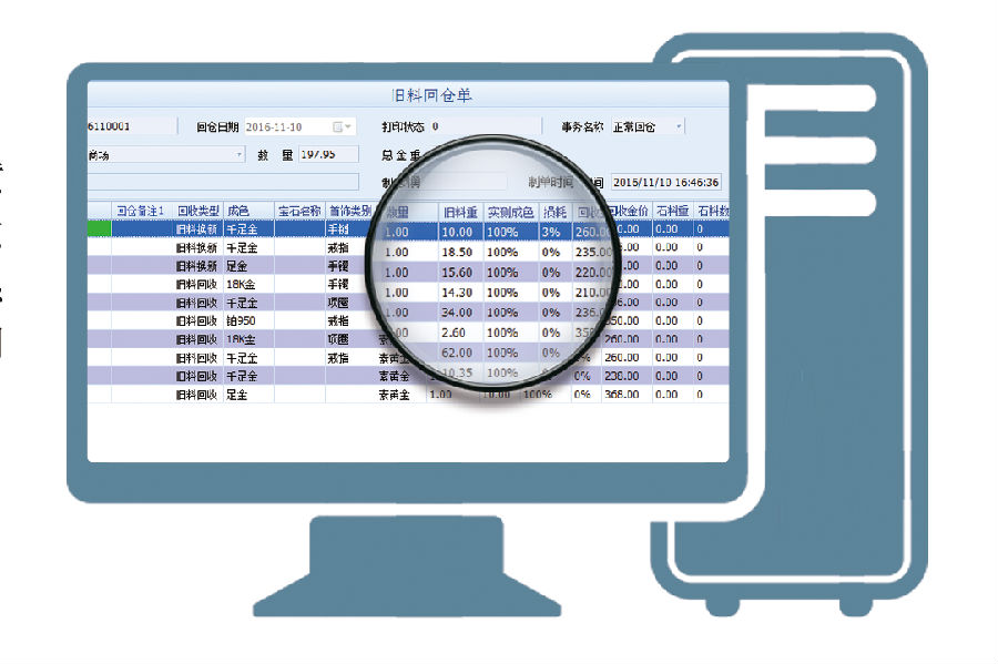舊金回收:對于經營素金類的企業(yè),記錄銷售點回收舊品(包括黃金等)信息數據,記錄回收類型的、飾品款型、成色、原始質量、抵扣質量等。在收銀過程對應收款進行相應的抵扣。系統(tǒng)可以按商場、類型、重量進行分類統(tǒng)計。同時根據舊金回收生成相應的舊金回倉(總部)單據。
